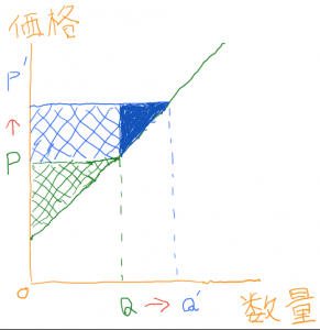 このとき、生産者余剰は緑の網掛け部分、青の網掛け部分、青色の三角形の合計に増大します。生産物の価格が上昇するということは、生産者が財に掛けるコストを一定とすると、利幅が大きくなるので、得られる収入が大きくなります。