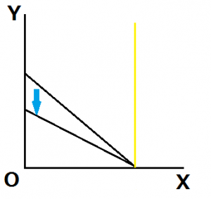 黒い線分を予算制約線、黄色い線分を無差別曲線とし、Y財の価格が下落したとします。このとき、水色の矢印方向に予算制約線がシフトします。しかし、無差別曲線の形状から、最適消費点は移動せずにとどまります。この時、代替効果及び所得効果は明らかに発生していません。