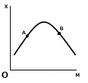 図の曲線をエンゲル曲線、エンゲル曲線上の任意の点をA,Bとします。まずは点Aから見ていきます。点Aにおいて、僅かに右にずらすと、すなわち、所得を少し増やすと、それに伴って点Aの位置はやや上に移動します。つまり、所得の増加に伴い数量が増大しているので、点Aにおいて財Xは上級財であることがわかります。