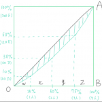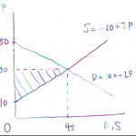 余剰分析の演習問題① 演習問題 Twitter Facebook はてブ Pocket LINE コピー 2020.10.032016.11.10 問題 需要曲線がP=100-D、供給曲線がP=S+20で与えられている。 この場合における消費者余剰はいくらになるか。 解説 与えられたそれぞれの曲線を図示すると以下のようになります。 P=S+20,P=100-Dを連立すると、P=60,D=S=40となることから、交点は上記の位置になります。斜線部分の三角形の面積が消費者余剰なので、この面積を求めます。 底辺をP軸側の部分、高さをD,S軸側の部分とみると、 斜線部分の面積=底辺×高さ÷2=(100-60)×40÷2=800
